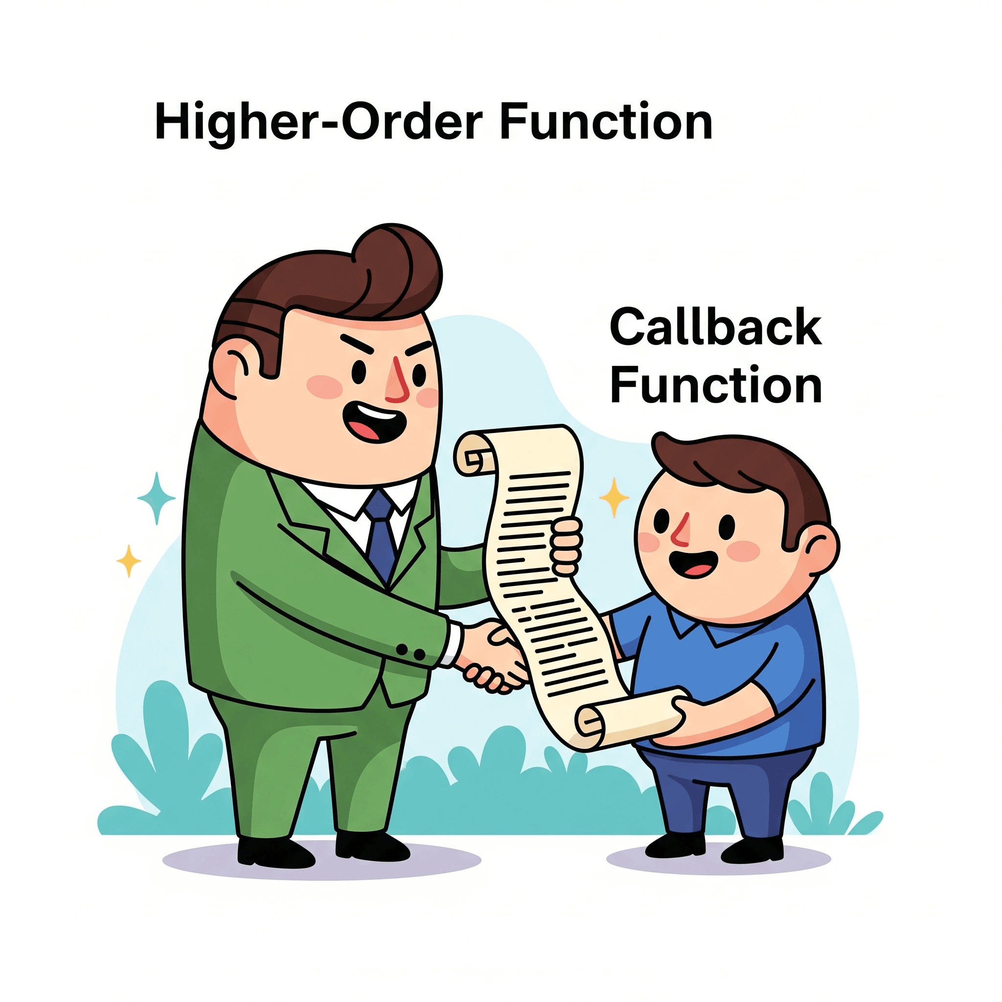 Think of a Higher-Order Function (HOF) as a manager, and a Callback Function as a specialist. The manager (HOF) needs to get a job done, but instead of doing it all themselves, they delegate a specific part of the task to a specialist (callback). The manager says, "Here, you do this part, and call me back when you're done!"
