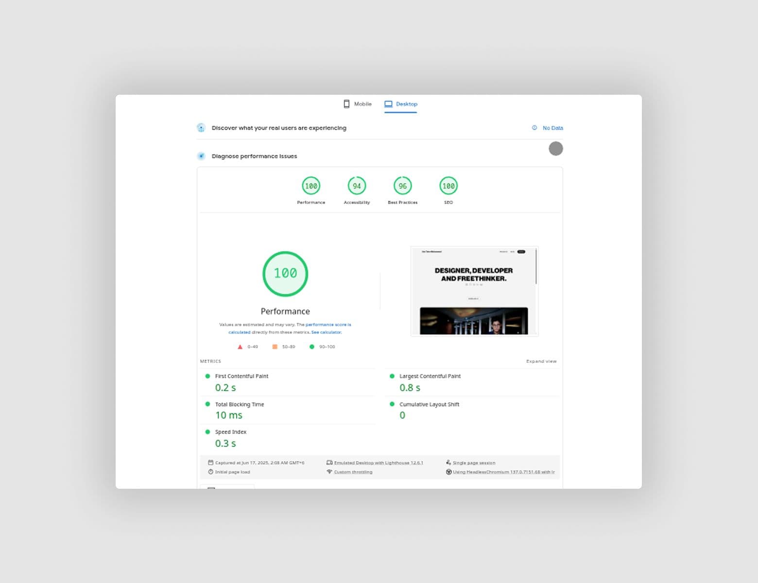 The result is a smooth, visually clean, and highly performant portfolio website that effectively showcases my skills and body of work. We successfully met the demanding performance targets, including the sub-0.2 second desktop FCP, delivering an instantaneous and engaging experience for visitors. This project stands as a testament to my ability to balance aesthetic minimalism with cutting-edge performance and robust content management.